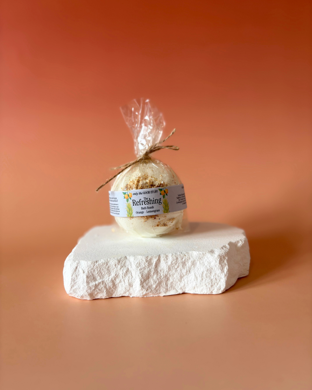 This Bath Bomb contains Orange and Lemongrass essential oils alongside dried orange peel, which are known for their abilities to lift moods and reduce stress.